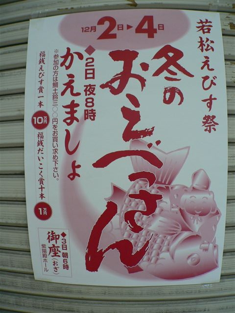 | 若松恵比寿神社は、神功皇后が洞の海の海中で見つけた光る石を海路の守護石として祀ったものが起源と神社に伝わる縁起で伝えられています。 また、若松という地名も、このときに同行していた武内宿禰が「松の一面に緑をなして、青々たる海原の濱たる。我心若し」と語ったことに由来すると縁起で伝えられています。 年2回、4月と12月に行われるえびす祭は「おえべっさん」と親しまれ、祭り中は約20万人の人出があるそうです。 |